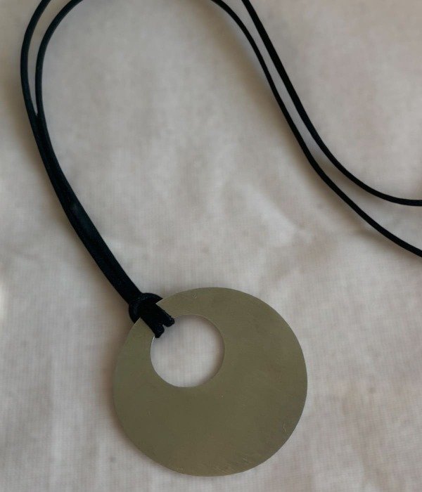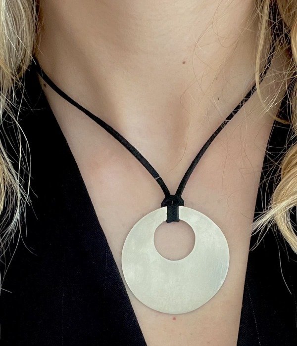 Collar con hilo de gamuza negro + dije circular de alpaca. Su largo permite que lo ates como quieras!